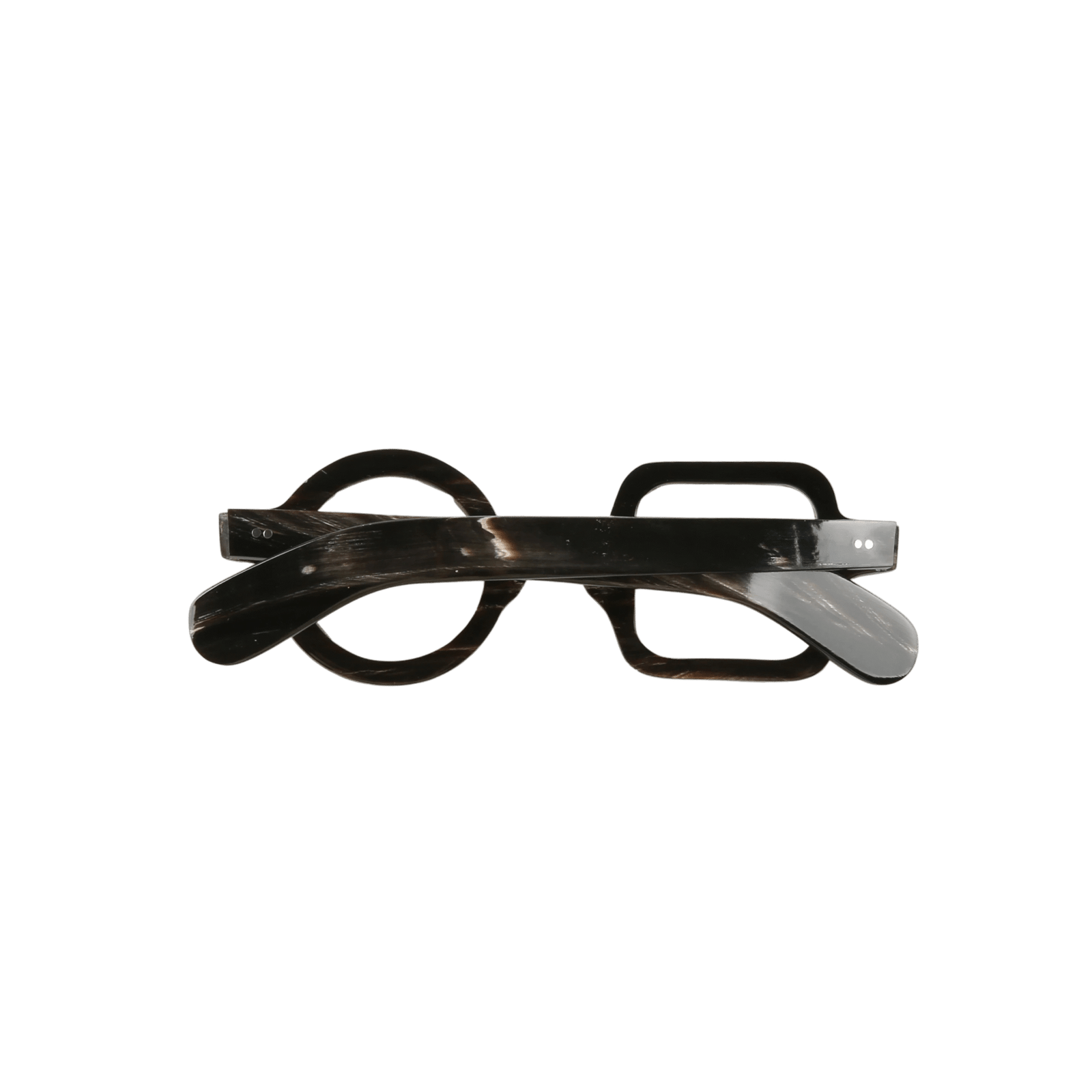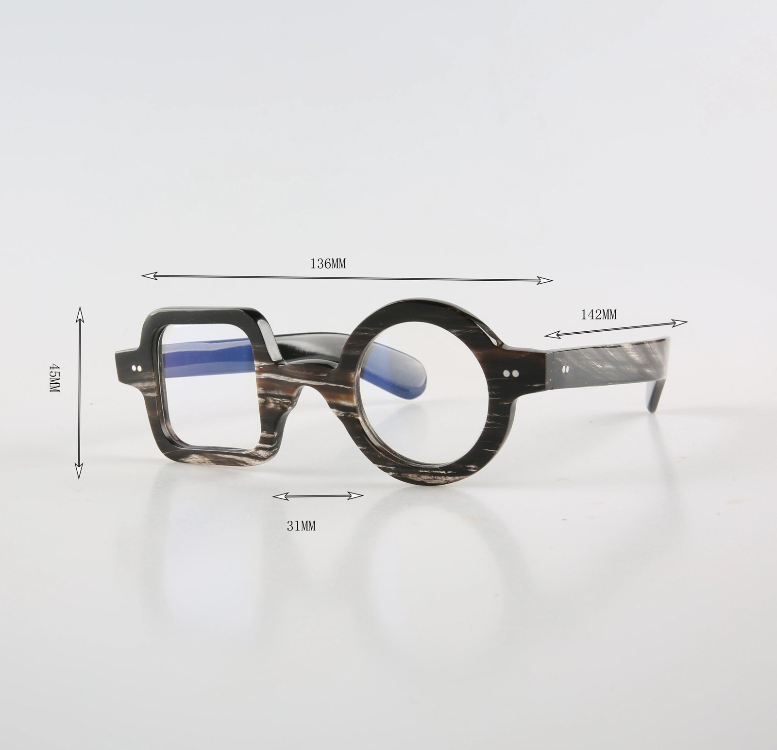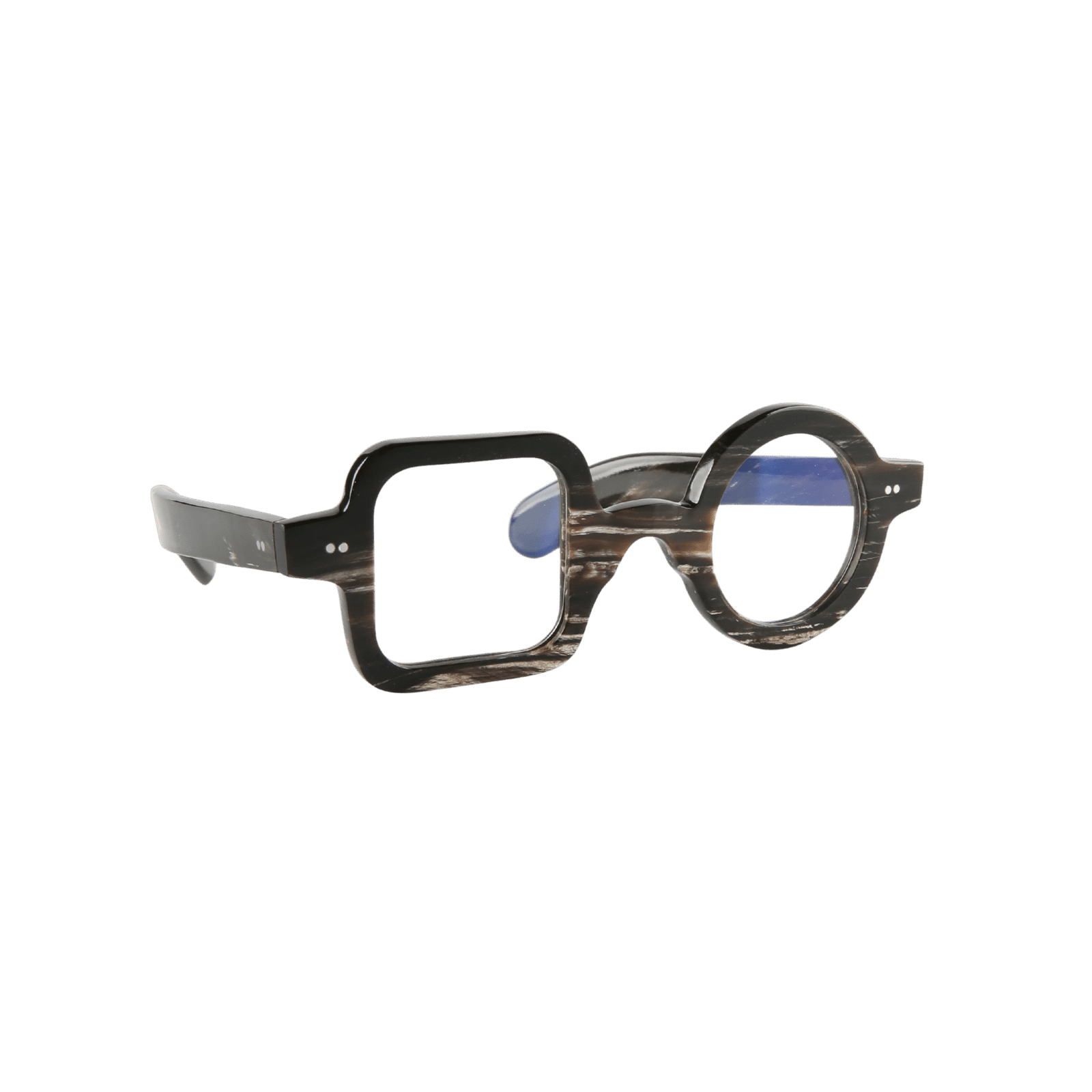 Boldly asymmetrical: one round lens, one square lens, both sculpted from ethically sourced buffalo horn for a look that turns conversation starters into lifetime companions.