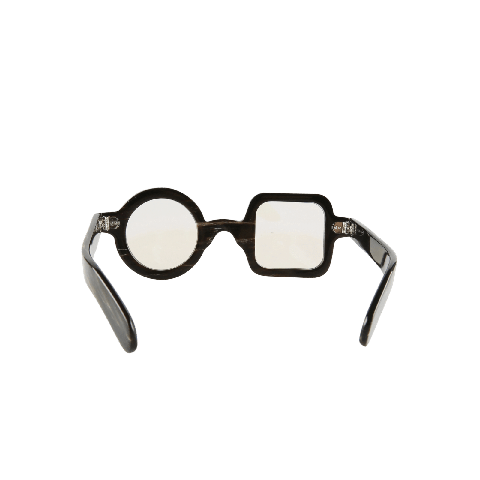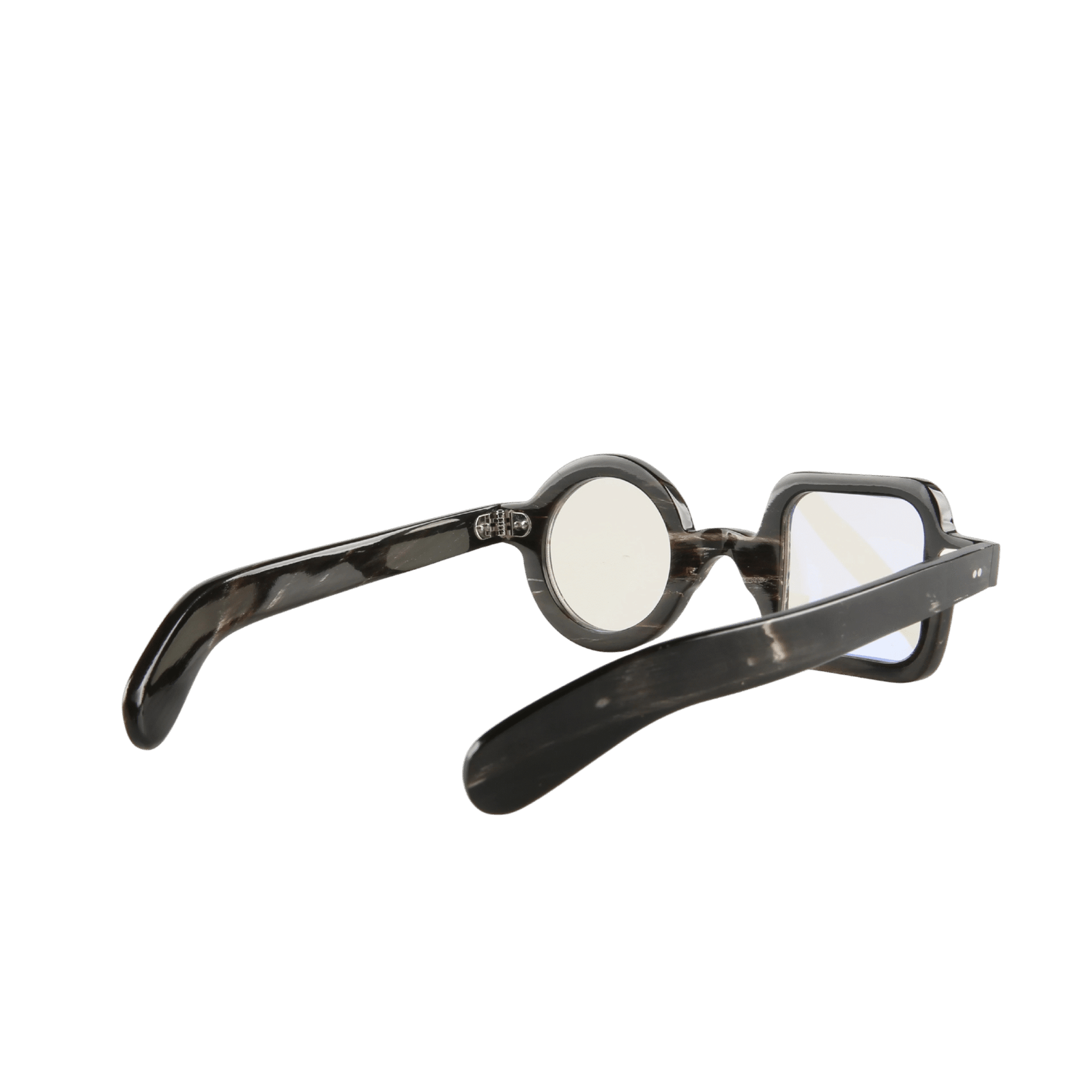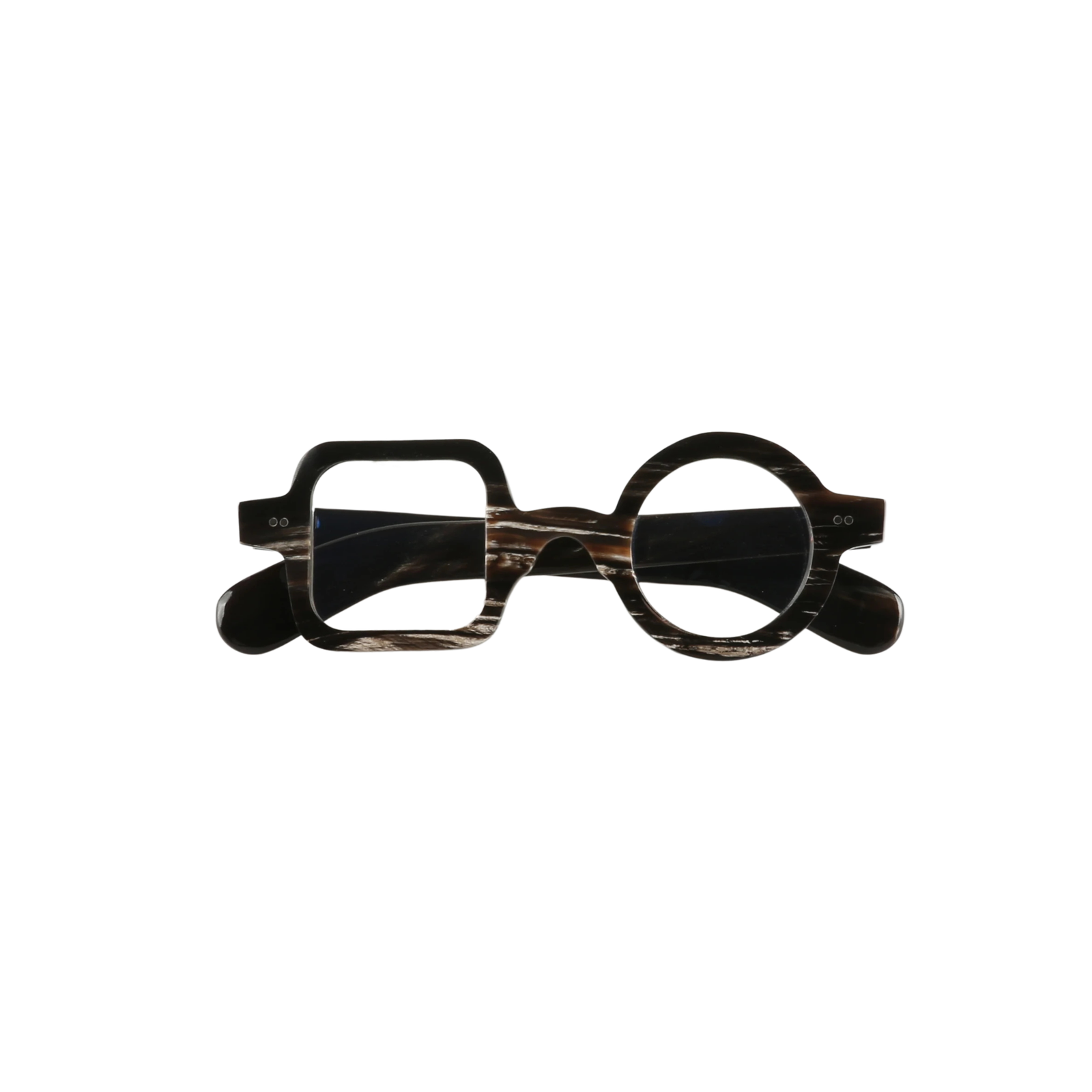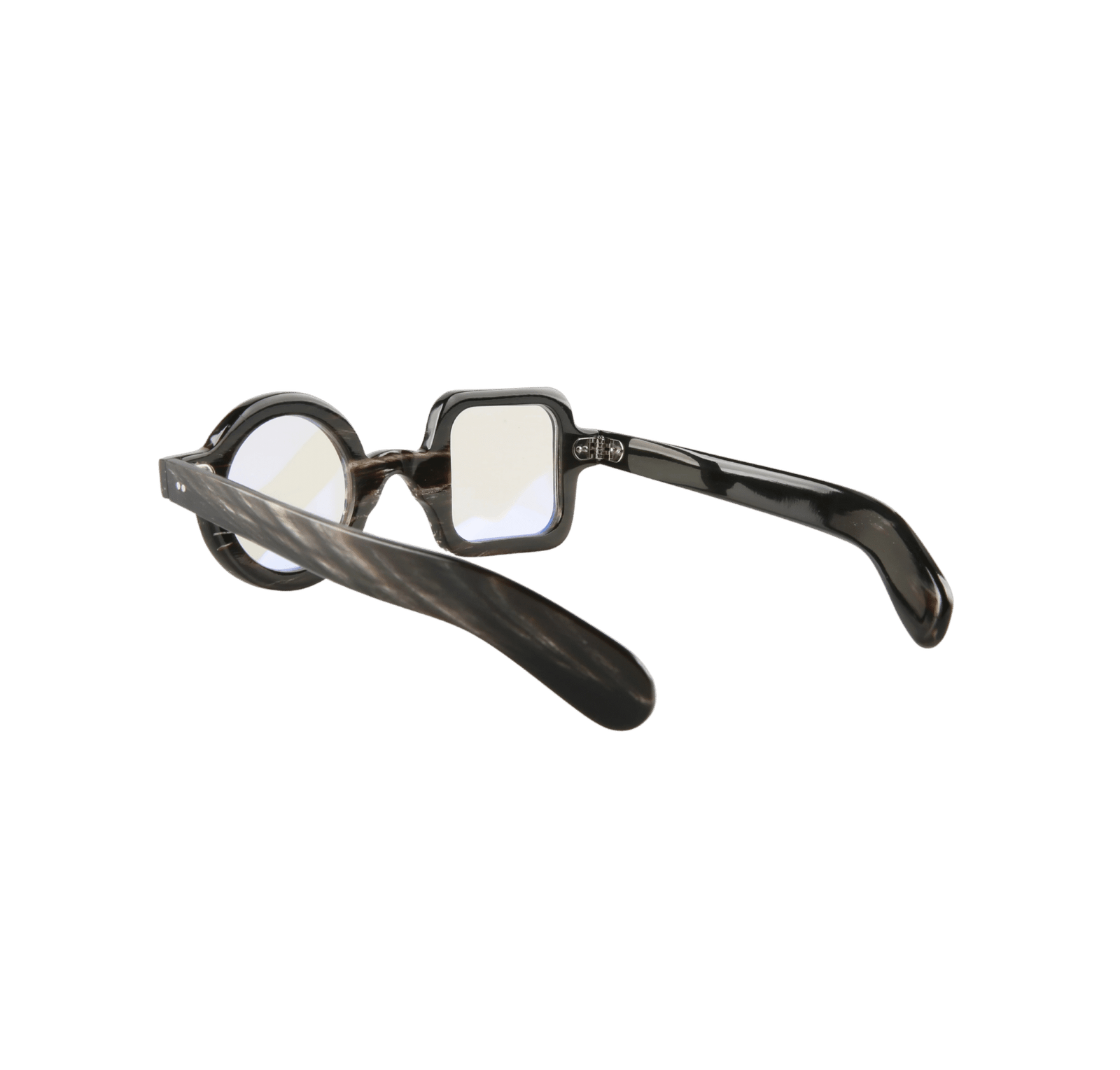 Boldly asymmetrical: one round lens, one square lens, both sculpted from ethically sourced buffalo horn for a look that turns conversation starters into lifetime companions.