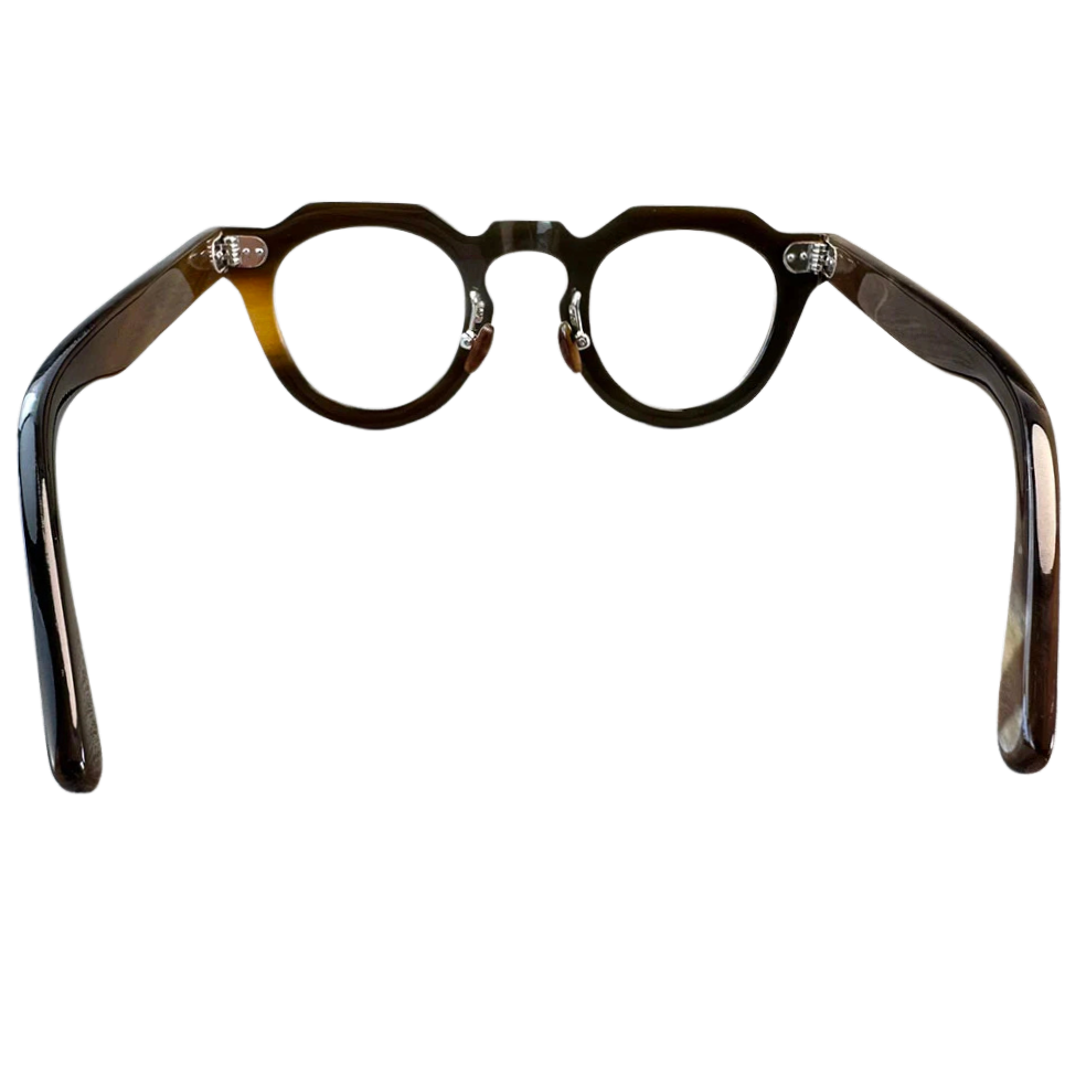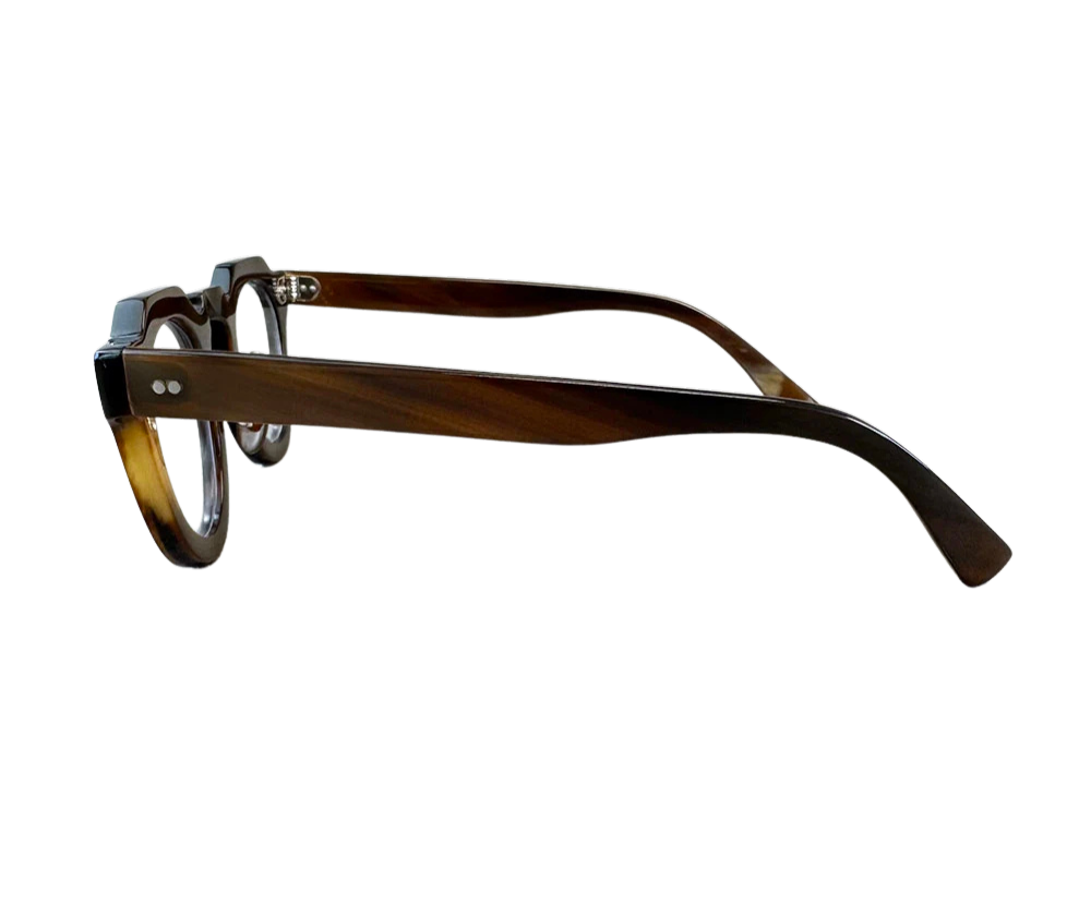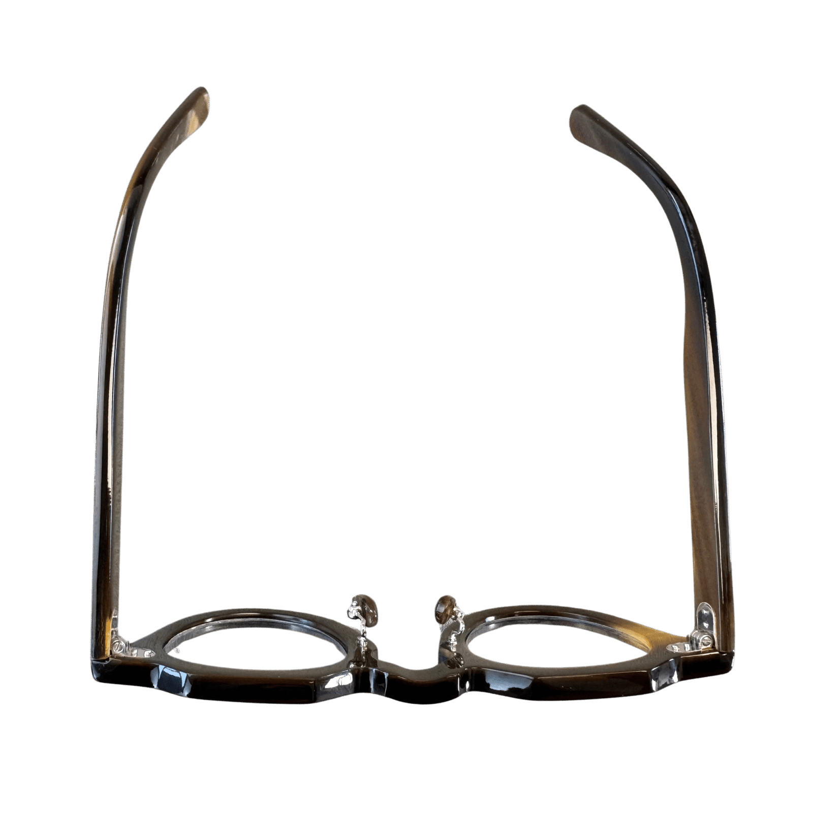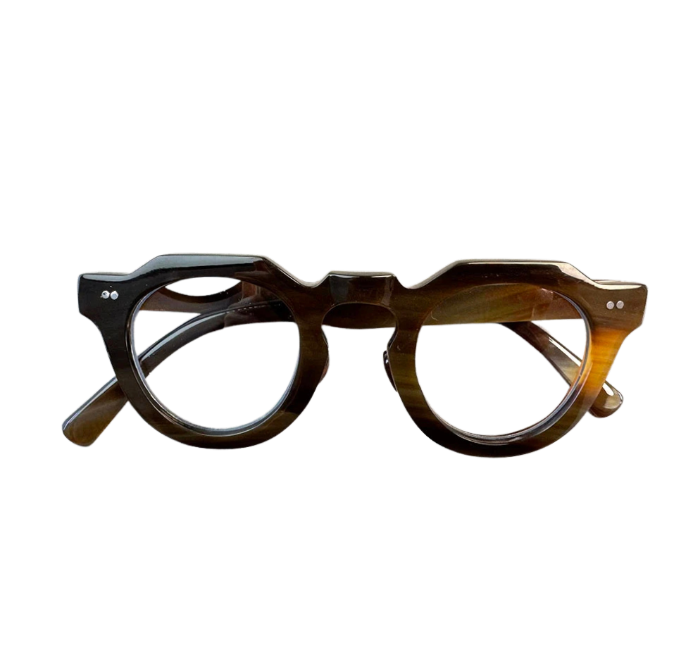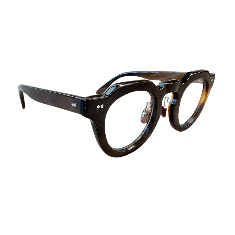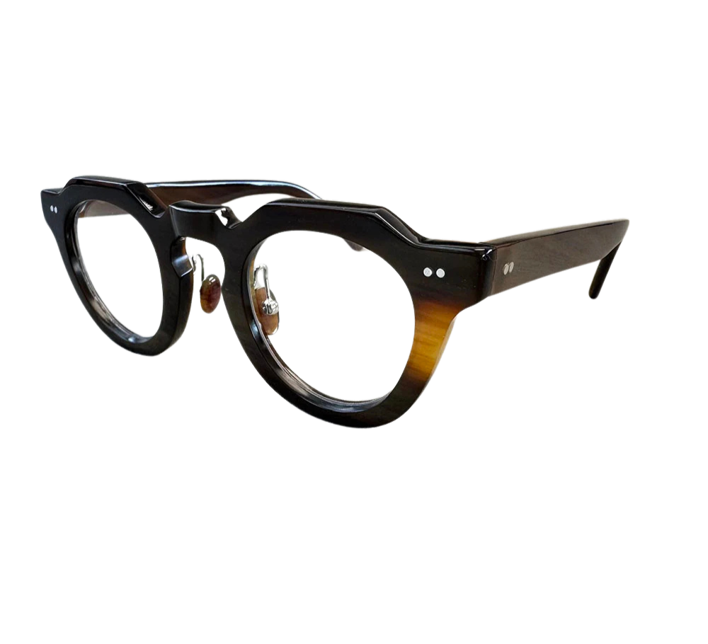Our atelier polishes every frame by hand. You can pick shades ranging from deep charcoal to warm espresso. We also cut and fit clear prescription lenses, gradient sun lenses or photochromic lenses on request. Spring hinges add strength, while hand-shaped horn nose pads keep the frame steady.